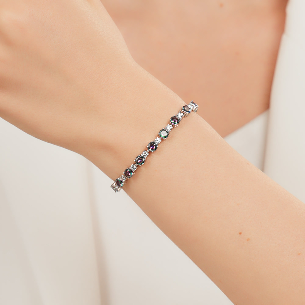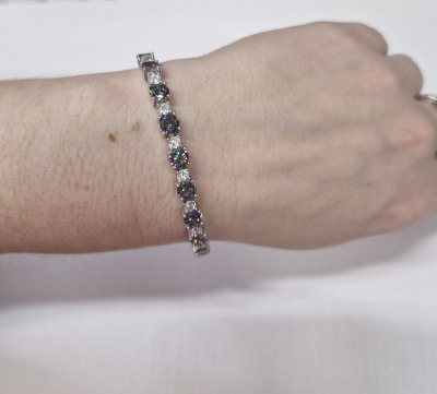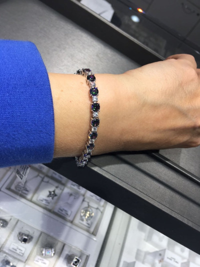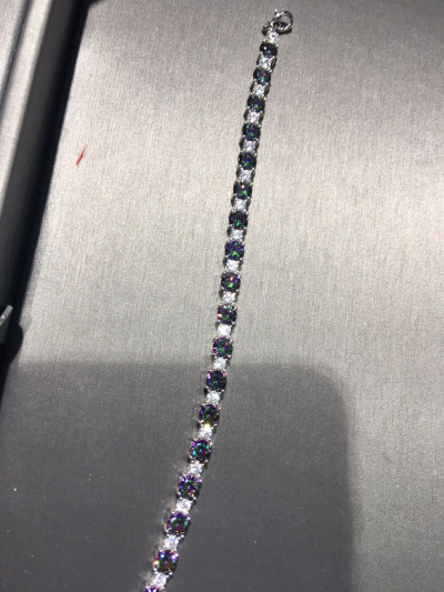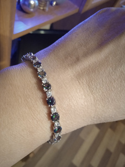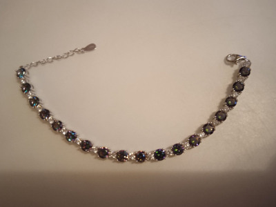 Мне нравится камень мистик, игра цветов. Браслет купила к серьгам, кольцу, кулону, так же с мистиком, приобретенные ранее тоже в Санлайте.