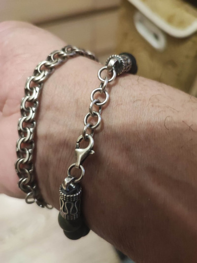 Класс. Размер 20 с удлиннителем до 23. На мою лапу застегнулся на крайнее колечко. Весь комплект покупался тут же в разное время. Увидел его на днях, посмотрел и ушёл... Через час вернулся. Примерил, засомневался, туговато как показалось. Ночью перечитал всё про камбабу... И пошёл покупать. В сети есть куча вариантов дешевле. Но всё на резинках. Этот на серебре. Всем удачи.