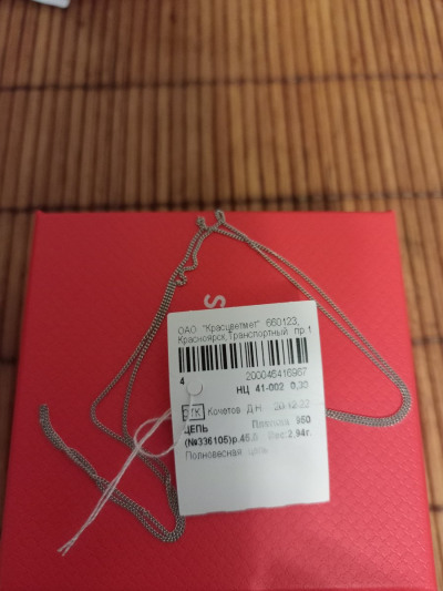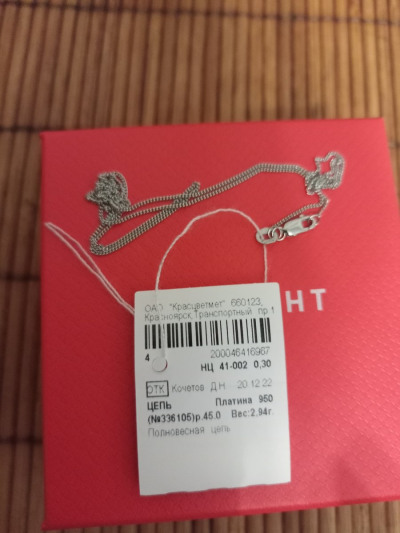 Цепочка тонкая, но плотная. Хорошее плетение. Искала именно такую. Основные критерии: тонкая; полновесная; гипоаллергенная; прочная; универсальная. Надеюсь, что найду подвеску из платины.