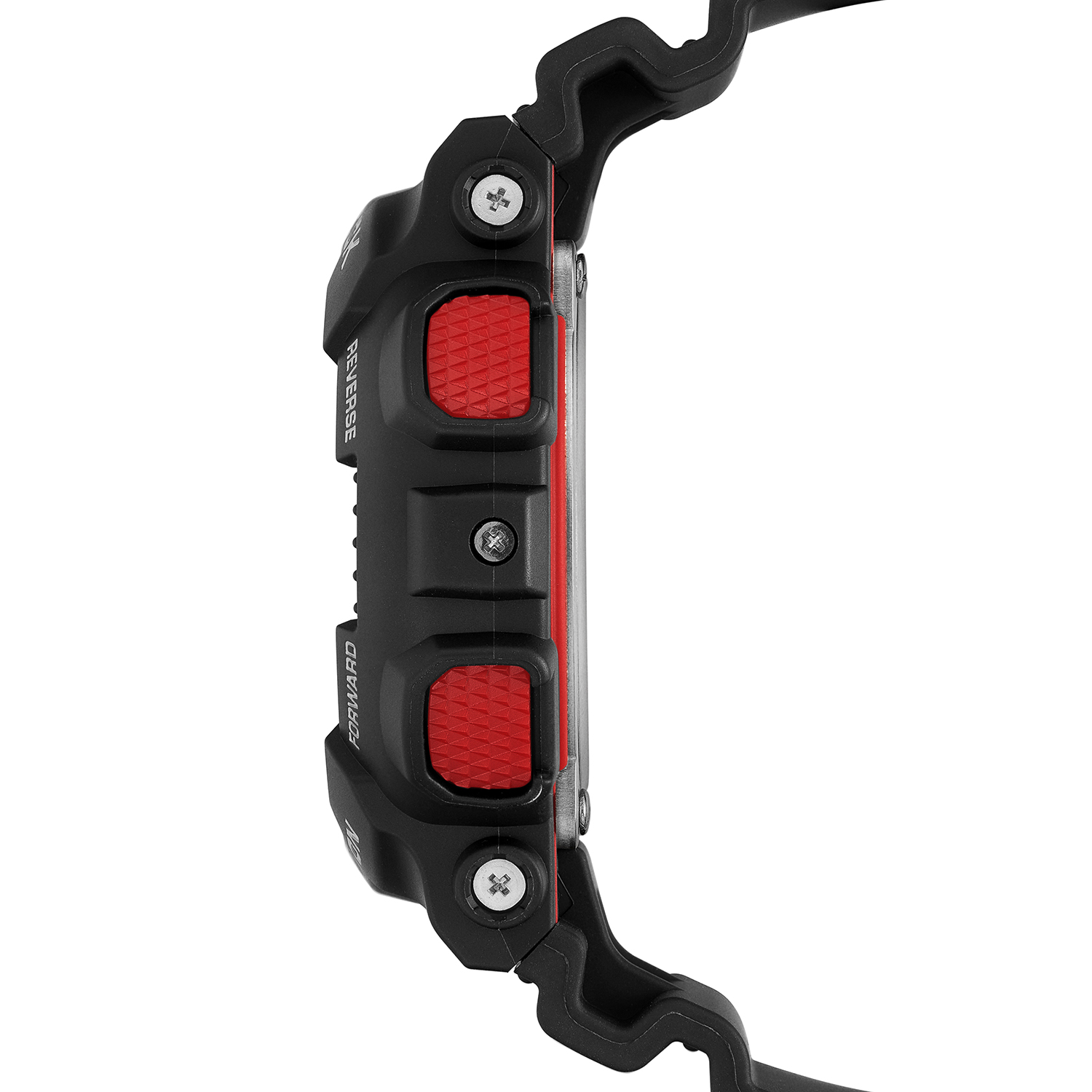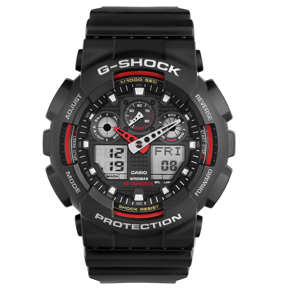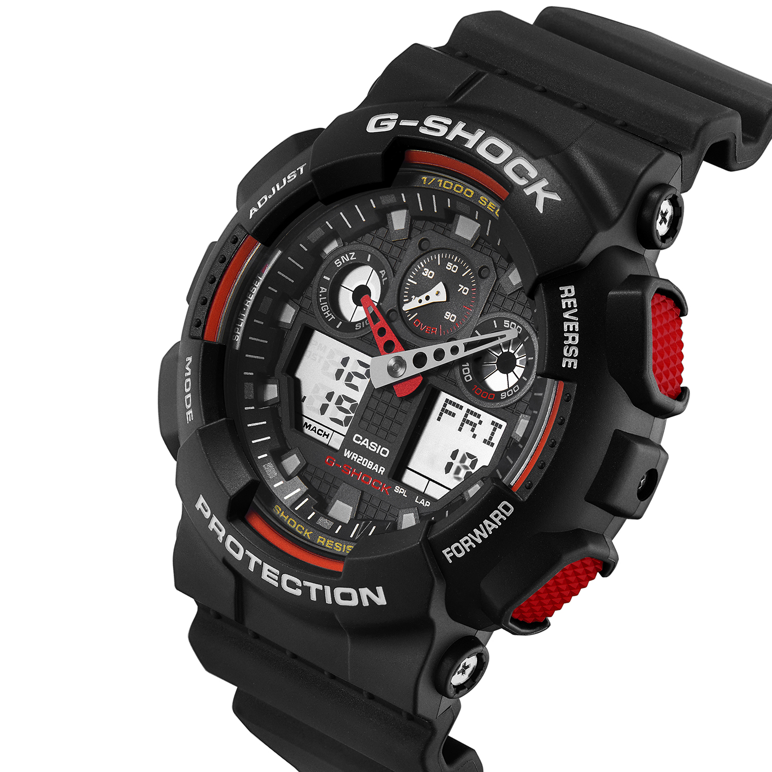 Брутальная модель G-SHOCK из серии GA-100 в черном корпусе и красными вставками с белыми стрелками не оставит равнодушным ни своего обладателя, ни окружающих людей, в чье поле зрения она попадет! На борту: привычная для джишоков противоударность, влагозащита и еще более десятка функций. Циферблат подсвечивается светодиодом, функция автоподсветки освещает циферблат при повороте часов к лицу. Защищены от магнитных полей. Секундомер с точностью показаний 1/1000 сек и временем измерения 100 часов. Расчет скорости по выбранной дистанции. Таймер обратного отсчета от 1мин до 24ч с автоповтором. Мировое время. 12-ти и 24-х часовой формат времени.