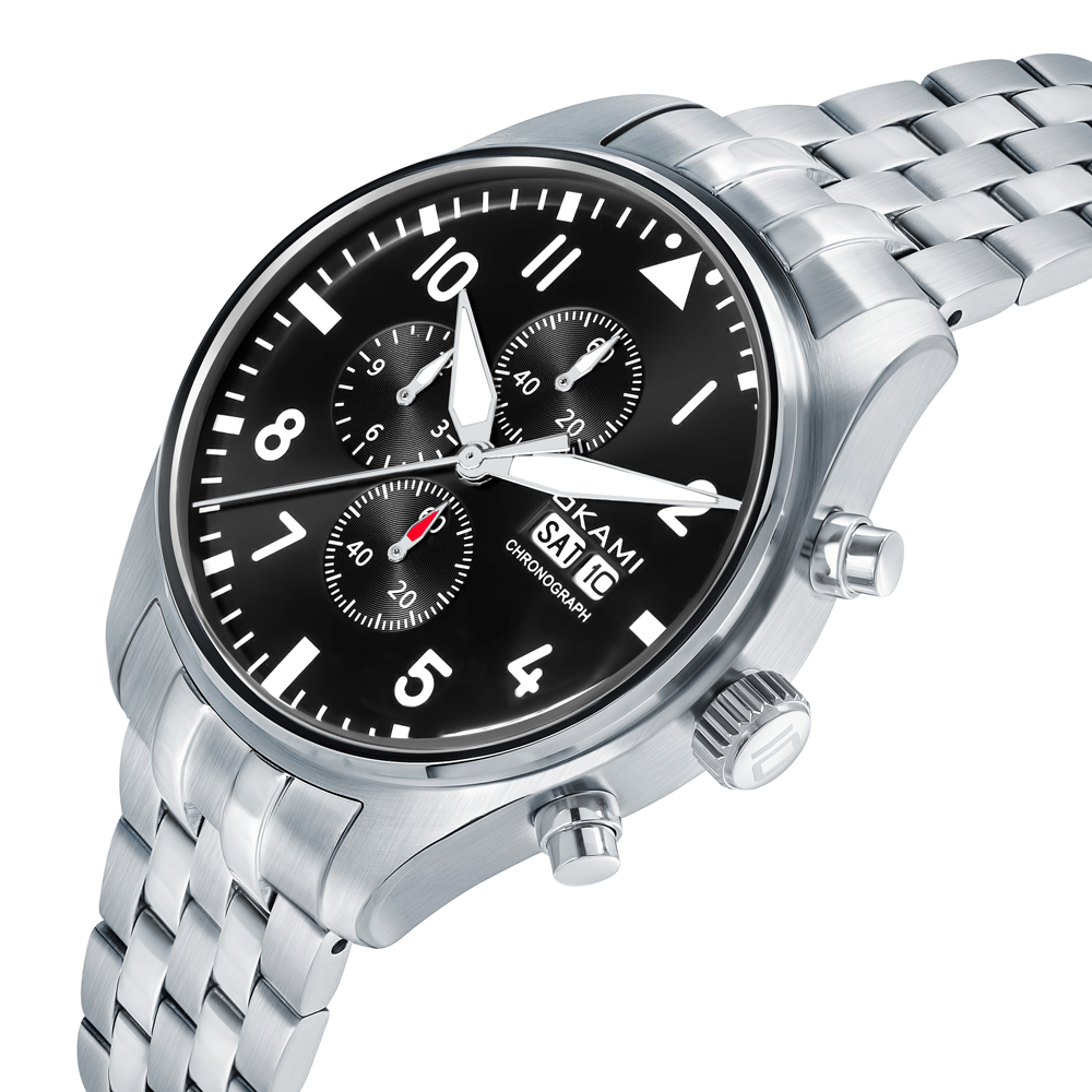 Отличный хронограф в пилотском стиле. Хорошая читаемость циферблата, дополнительные шкалы не мешают. Единственно, большую секундную стрелку можно было бы сделать поконтрастнее- на чёрном фоне чёрная она теряется. За счёт того, что циферблат занимает почти весь корпус, часы кажутся больше, чем есть на самом деле. Ремешок традиционно коротковат, на окружность запястья 21 см еле хватает. В целом очень доволен.