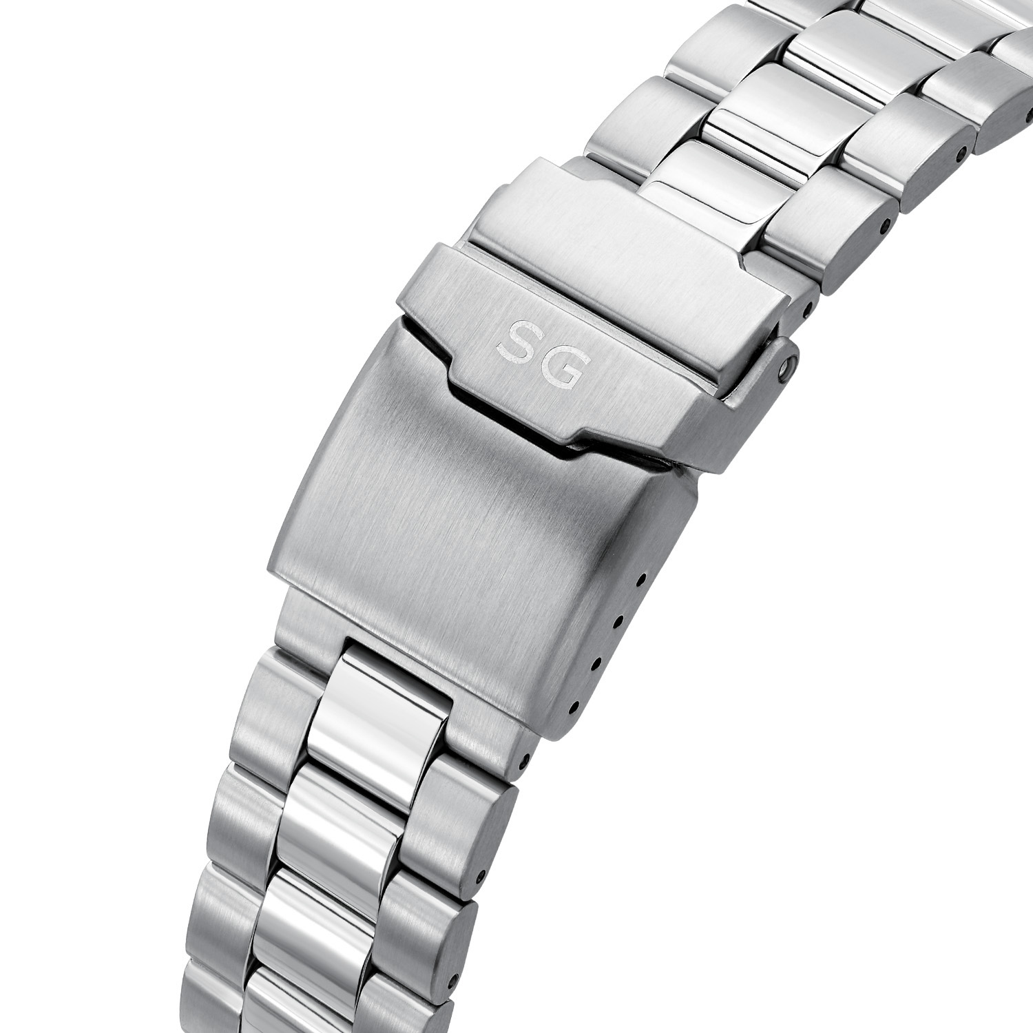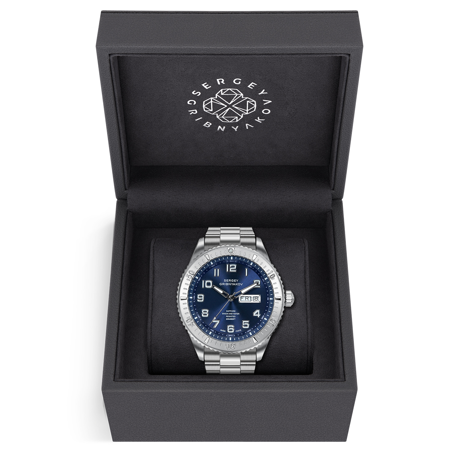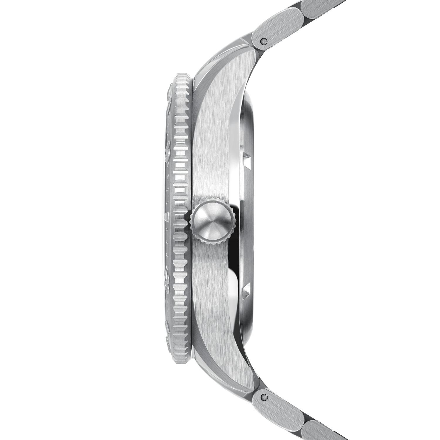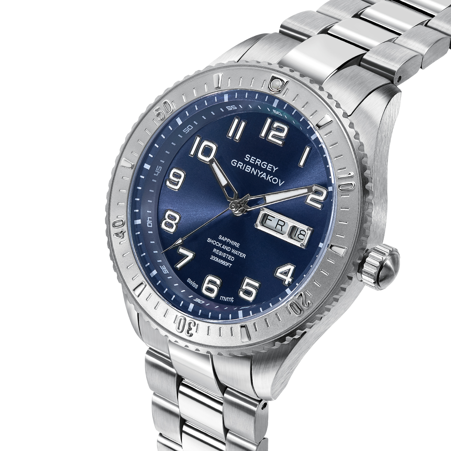 Корпус выполнен из стали 316L, сапфировое стекло с антибликом защищает циферблат от внешнего воздействия. Надежный швейцарский кварцевый механизм Ronda 517 оснащен функциями времени в 12 часовом формате, секундной стрелкой, датой и хронографом. Водозащита 20 bar (200 m/660 ft)* позволяет плавать и погружаться в часах.