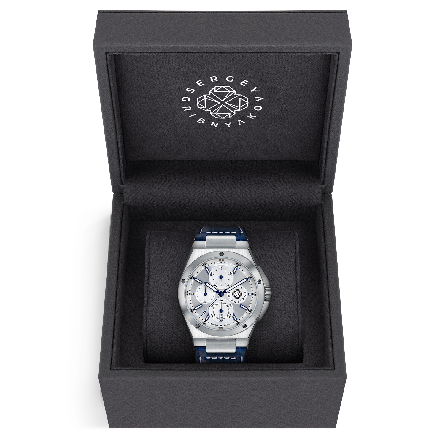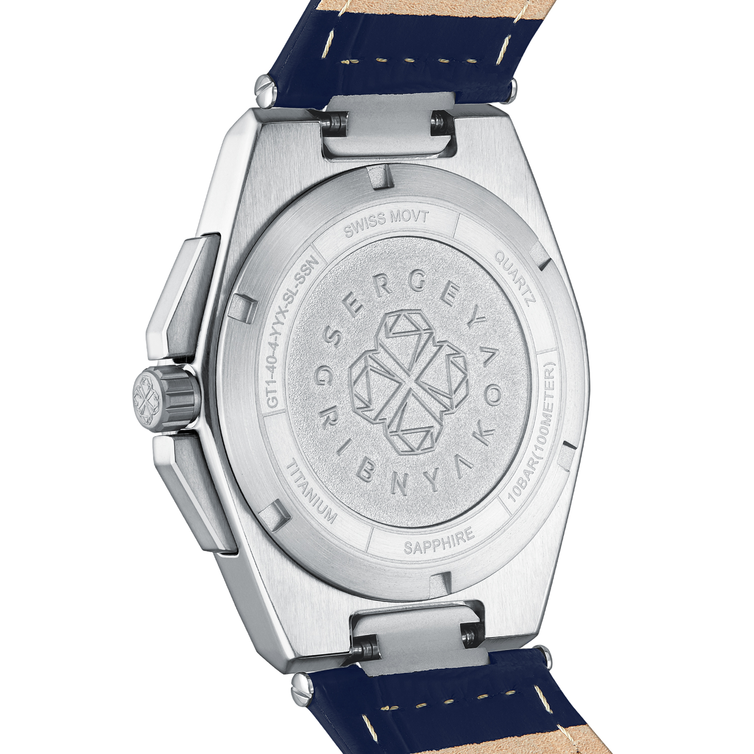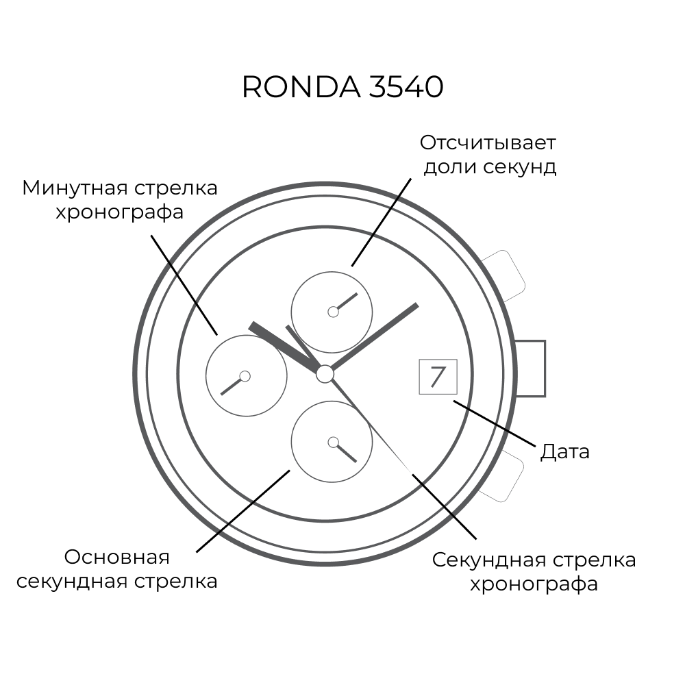 Корпус выполнен из титана. Он легче и прочнее стали. Сапфировое стекло с антибликом защищает циферблат от внешнего воздействия. Надежный швейцарский кварцевый механизм Ronda 3540 оснащен функциями времени в 12 часовом формате, секундной стрелкой, датой и хронографом. Водозащита 10 bar (100 m/330 ft)* позволяет плавать в часах.