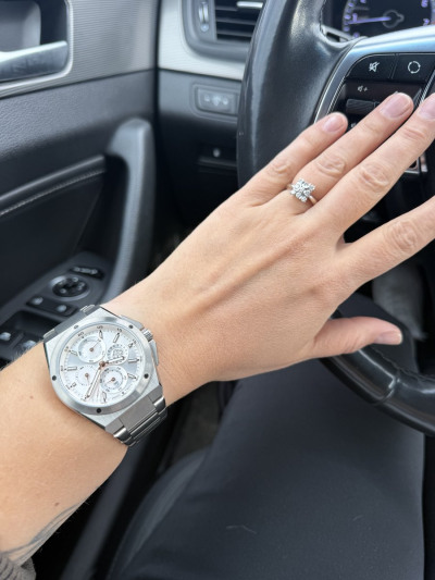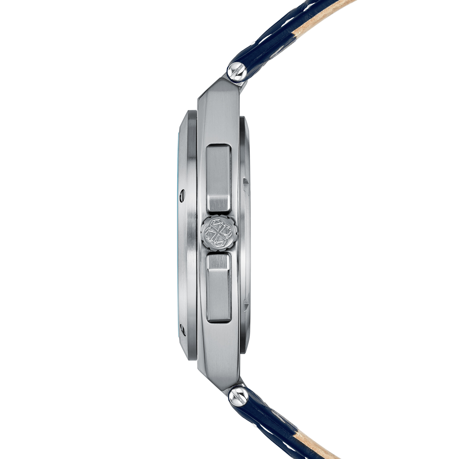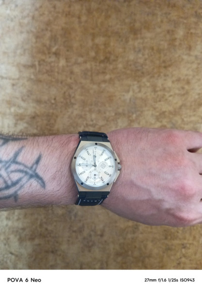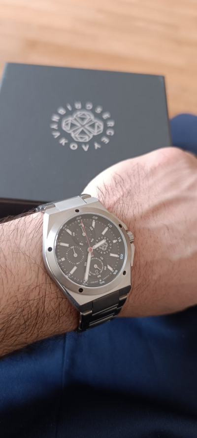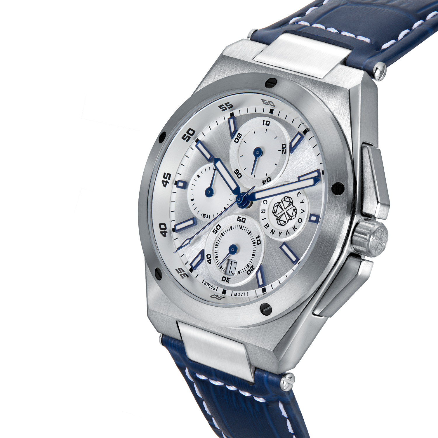 Корпус выполнен из титана. Он легче и прочнее стали. Сапфировое стекло с антибликом защищает циферблат от внешнего воздействия. Надежный швейцарский кварцевый механизм Ronda 3540 оснащен функциями времени в 12 часовом формате, секундной стрелкой, датой и хронографом. Водозащита 10 bar (100 m/330 ft)* позволяет плавать в часах.