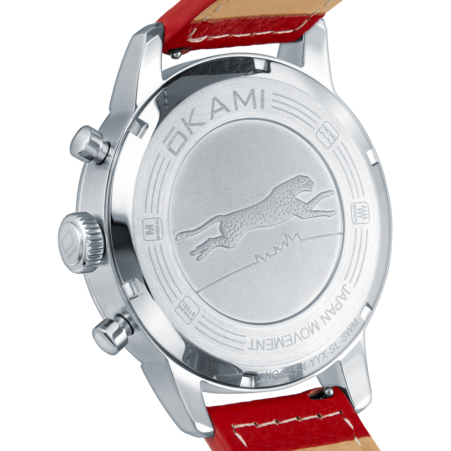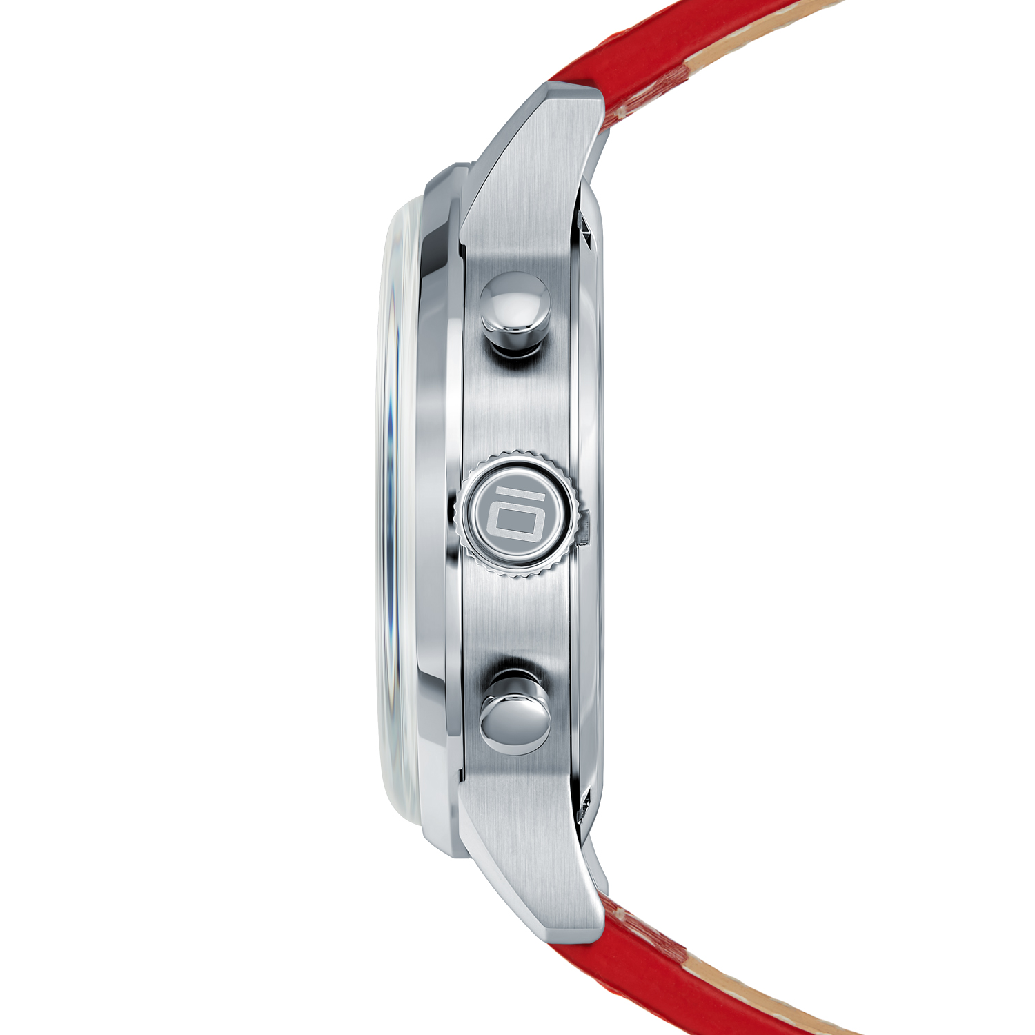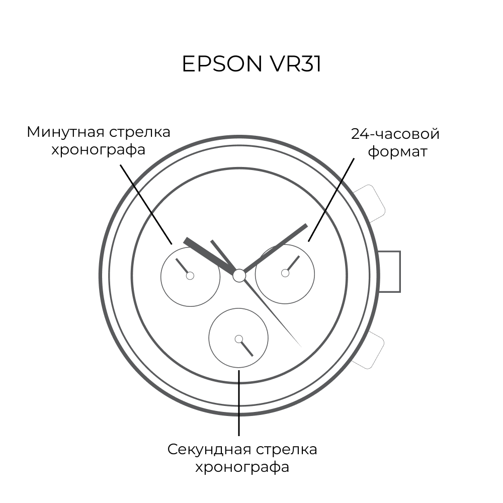 Корпус выполнен из стали, минеральное стекло с антибликом защищает циферблат от внешнего воздействия. Японский кварцевый механизм EPSON VR31 обеспечивает точный ход и оснащен функциями времени в 12/24 часовом формате, секундной стрелки, даты и хронографа. Водозащита 10 bar (100 m/330 ft)* позволяет плавать в часах.