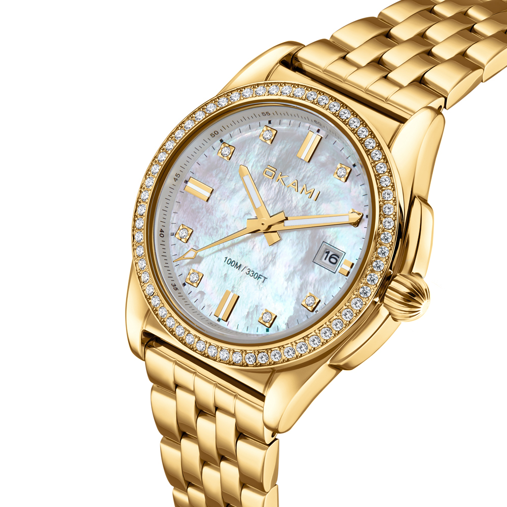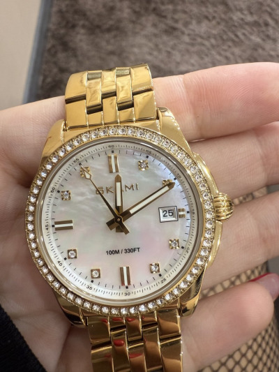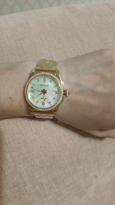 Очень понравились часики.Похожи на золотые.Красиво переливаются.В темноте хорошо видно циферблат, стрелки светятся.В магазине девушки-консультанты помогли браслет подогнать по руке.