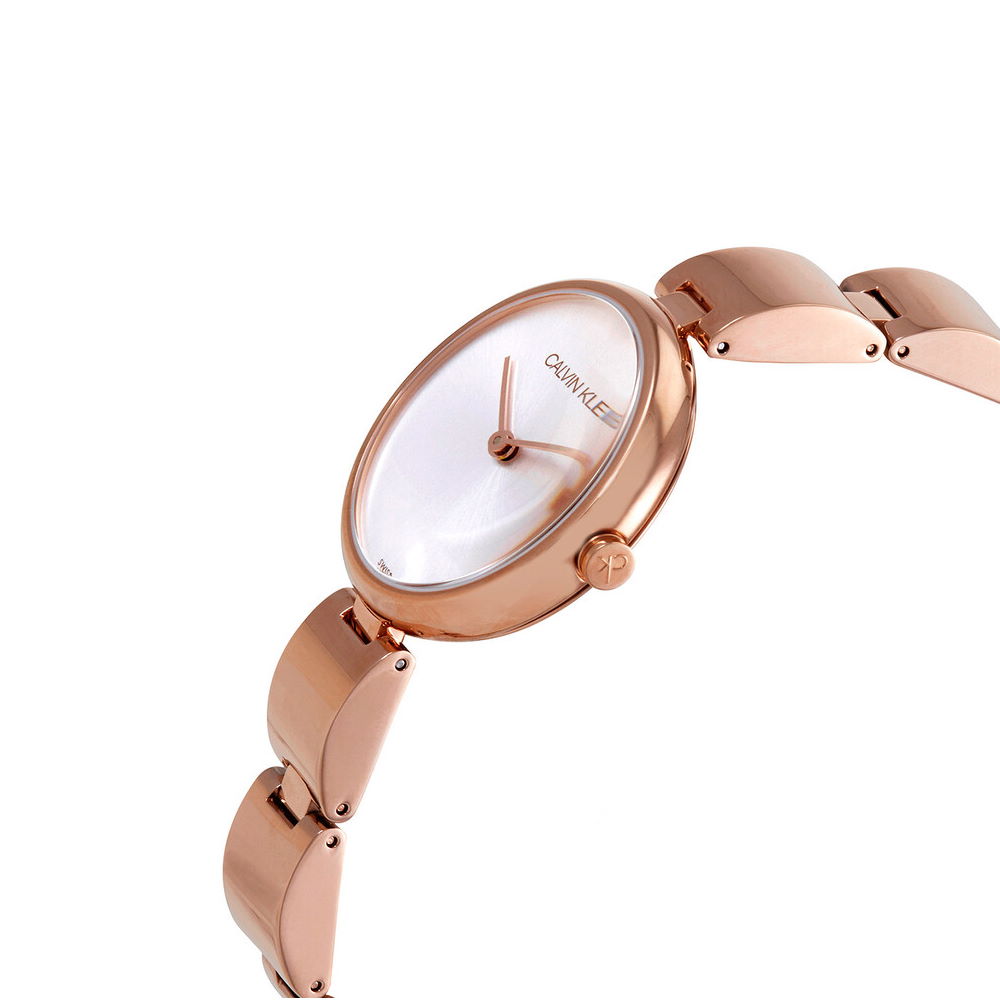 Женские кварцевые часы Calvin Klein коллекция Swing модель K9U23646. Круглый корпус из нержавеющей стали. PVD покрытие цвета розового золота. Аналоговый циферблат серебристого цвета. Тонкие аккуратные стрелки. Швейцарский кварцевый механизм ETA 901.001 использующий элемент питания RENATA 321 (SR616SW). Устойчивое к царапинам минеральное стекло. Заводная головка с защитой. Прочная задняя крышка. Размер корпуса: 32 мм. Толщина корпуса: 8 мм. Ширина ремешка: 11 мм. Стыковочные звенья с застежкой ювелирного типа. Водостойкость 3 АТМ (защита от брызг). Остерегайтесь попадания часов в воду. Функции: часы, минуты. Компания CALVIN KLEIN WATCH + JEWELRY Co. Ltd. занимает ведущую позицию среди эксклюзивных представителей швейцарского часового искусства в сегменте модной индустрии. Маркировка SWISS MADE, расположенная внизу циферблата, означает что полный цикл производства изделия располагается в Швейцарии.