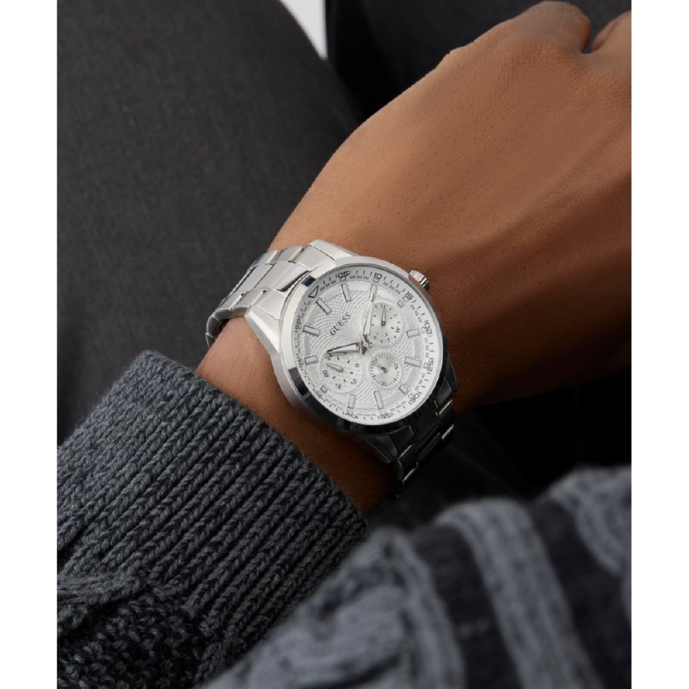 Мужские оригинальные кварцевые часы GUESS артикул GW0963G1 из коллекции SPORT. Стальной корпус размера 44 мм толщиной 10.1 мм ,средний вес 123.7 гр. Японский кварцевый механизм VX7J работающий на элементе питания SR927SW. Минеральное стекло. Водозащищенность 3 bar (30 m/99 ft) допускает попадание на корпус влаги. НЕ ПОГРУЖАТЬ изделие в воду. Штаб-квартира компании GUESS расположена в Лос-Анджелес США. Часы марки производятся на дву заводах компании, расположенных в Китае и на Филиппинах. У нас представлены модели выпущенные на Филиппинском заводе. В моделях используются надежные японские механизмы Miyota и Seiko. ВНИМАНИЕ! Заявленная водостойкость гарантируется только при плотно закрытой или закрученной заводной головке!
