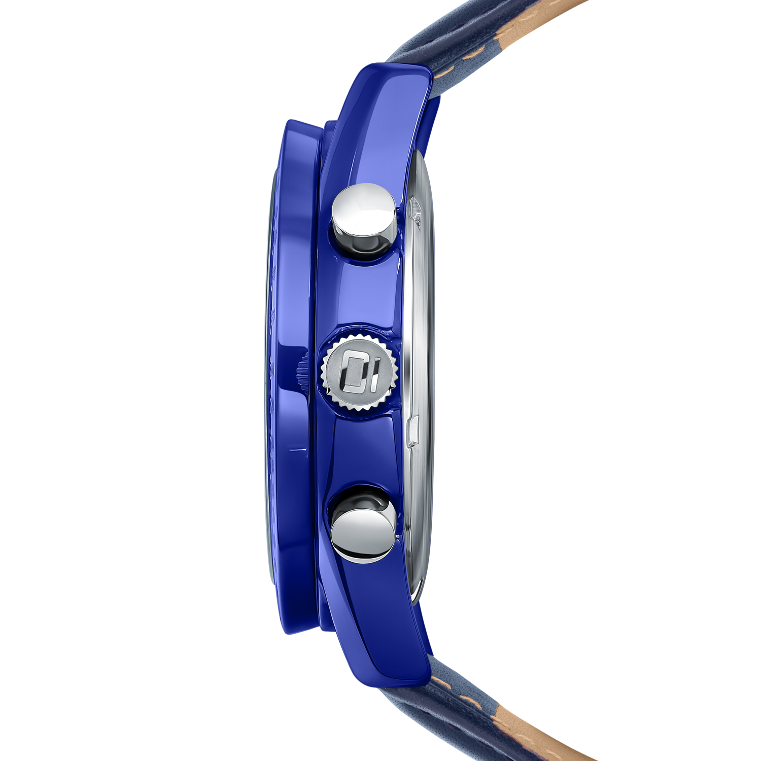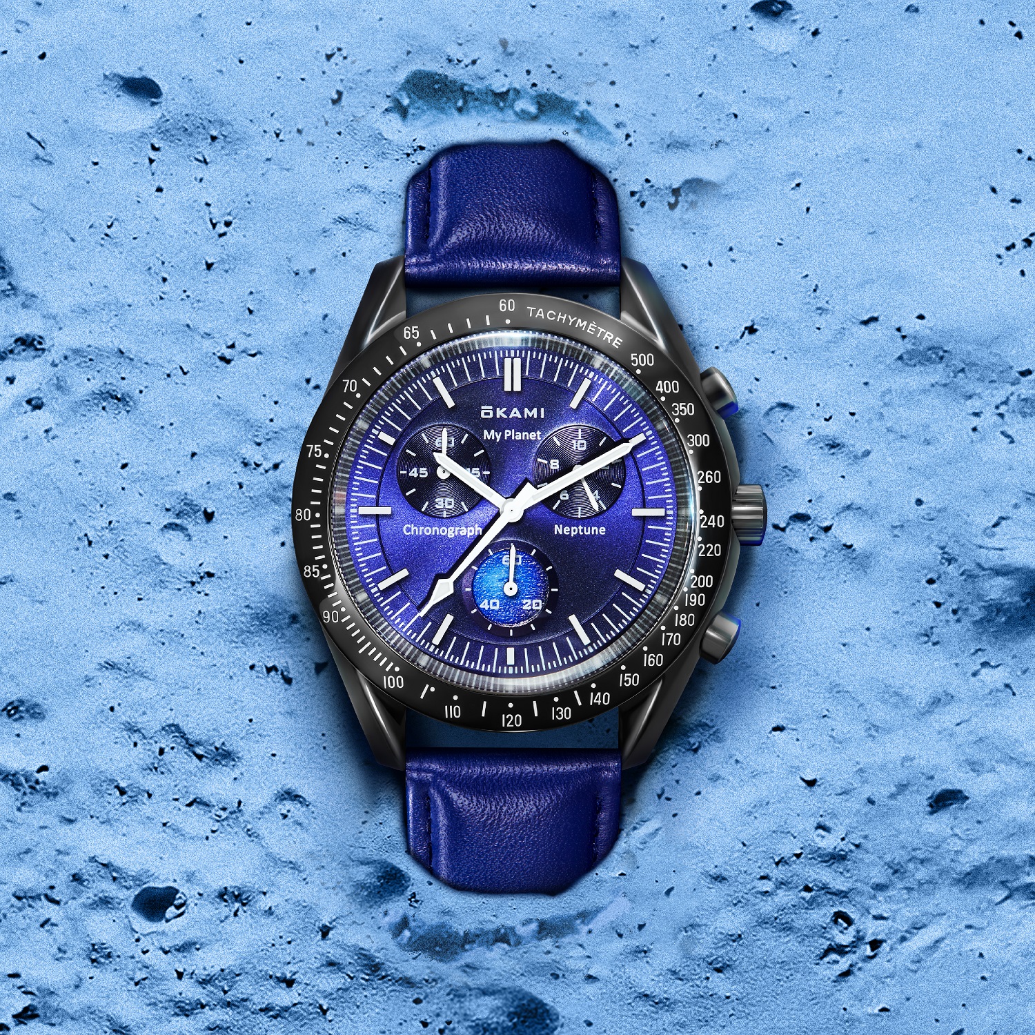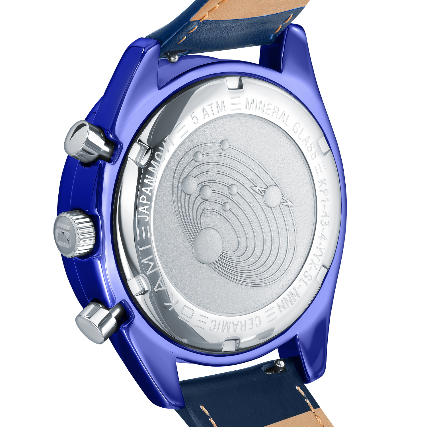 Часы диаметром 43 мм имеют корпус синего цвета, выполненный из керамики и дополненный керамическим безелем с тахиметрической шкалой. К ним прилагается ремешок из натуральной кожи. Циферблат с изображением Нептуна защищен минеральным стеклом. Японский кварцевый механизм Miyota JS00 обеспечивает точных ход и оснащен функциями времени в 12 часовом формате, секундной стрелки и хронографа. Водозащита 5 bar (50 m/165 ft) позволяет мыть руки в часах, а так же защитит от брызг и дождя.- Артикул987040