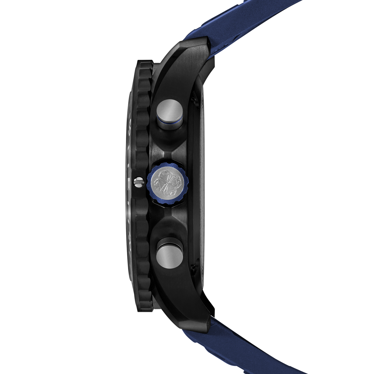 Корпус выполнен из титана. Он легче и прочнее стали. Сапфировое стекло с антибликом защищает циферблат от внешнего воздействия. Надежный швейцарский кварцевый механизм Ronda 5030D оснащен функциями времени в 12 часовом формате, секундной стрелкой, датой и хронографом. Водозащита 10 bar (100 m/330 ft)* позволяет плавать в часах.
