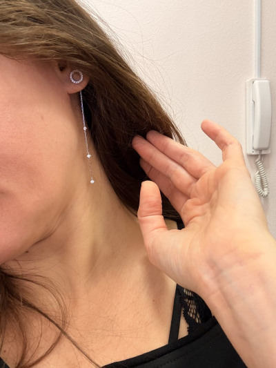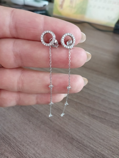 Серьги очень понравились. Красиво смотрятся на ушках. Очень нравится, что «висюльки» не просто цепочки а с камушками. А главное цепочка прикреплена к застежке, и по сути можно носить с любыми другими гвоздиками (не с винтовым замком)