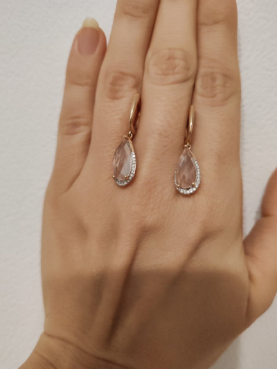 Золотые серьги с бриллиантами природными и кварцами розовыми