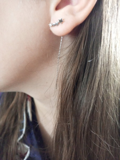 Легкие невесомые В мочке уха несколько звездочек и фионитом и по задней стороне мочки цепочка