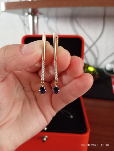 Симпатичные серьги с сапфирами и фианитами,покупала к крестику с сапфирами- гармонирует прекрасно! Думала серьги будут поменьше,а в реальности-приятно удивлена!