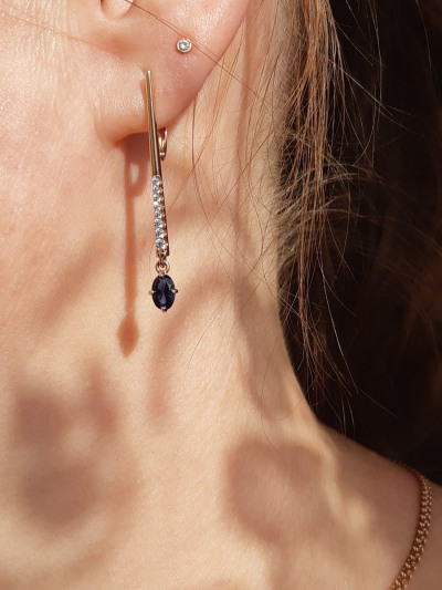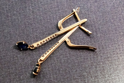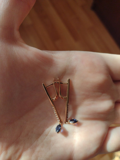 Мне понравились дизайном. Хотела длинненькие и висюльками и вот нашла . Есть дорожка фианитами небольшая и сапфир. Когда застегиваешь серёжку есть щелчок.
