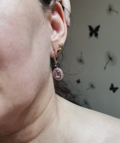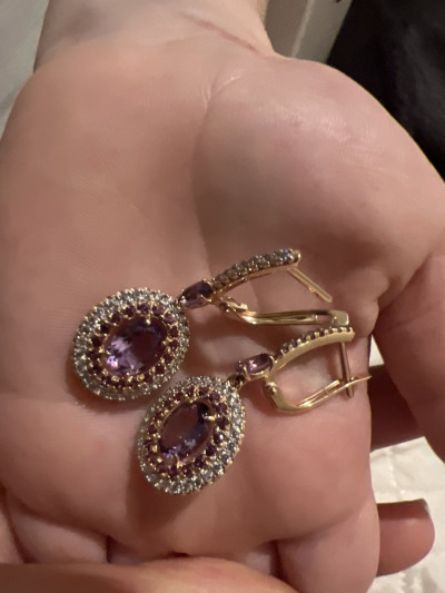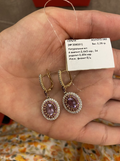 Золотые серьги с фианитами, аметистами природными и родолит природными