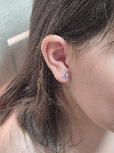 Купили их в качестве первых серёжек для трёхлетней девочки. По размеру красивые малюсенькие детские серьги, но!! Смутила длина гвоздика, совсем не детская. Боюсь, что ребёнку будет больно носить, так как будет упираться острым краем гвоздика за ушами.