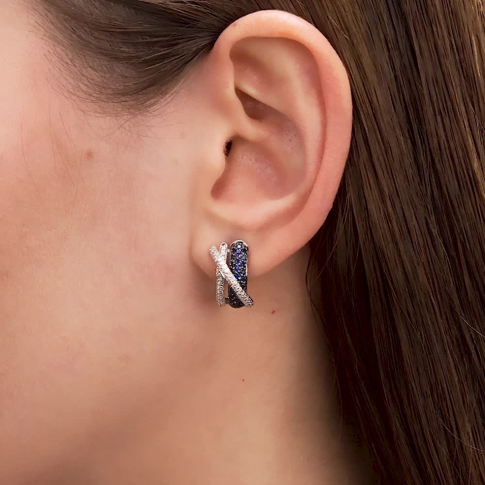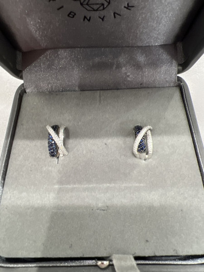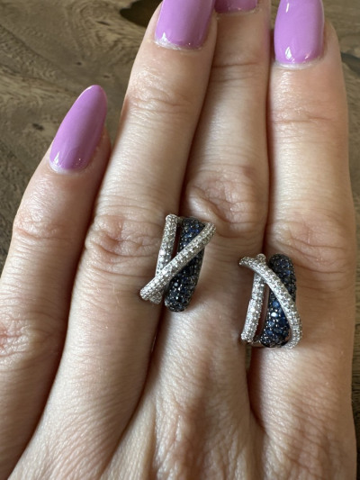Модные золотые серьги с сапфирами и бриллиантами в белом золоте. Интересный вариант, есть в комплект кольцо.