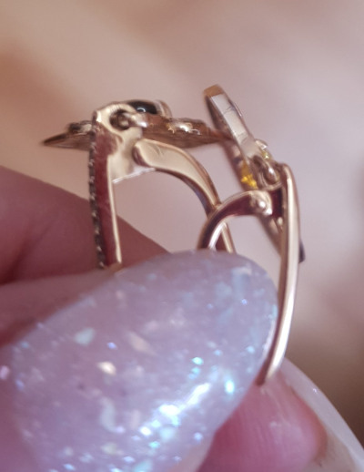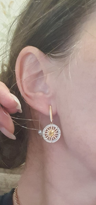 Шикарные серьги, очень атмосферные, камни все сверкают и переливаются. Одно но: соединительные кольца, подвижной части и верхней очень тонкие (добавила фото сравнения с другими серьгами). Хорошо садятся на тонкую мочку, вес комфортный. Серьги смотрятся заметно и ярко.