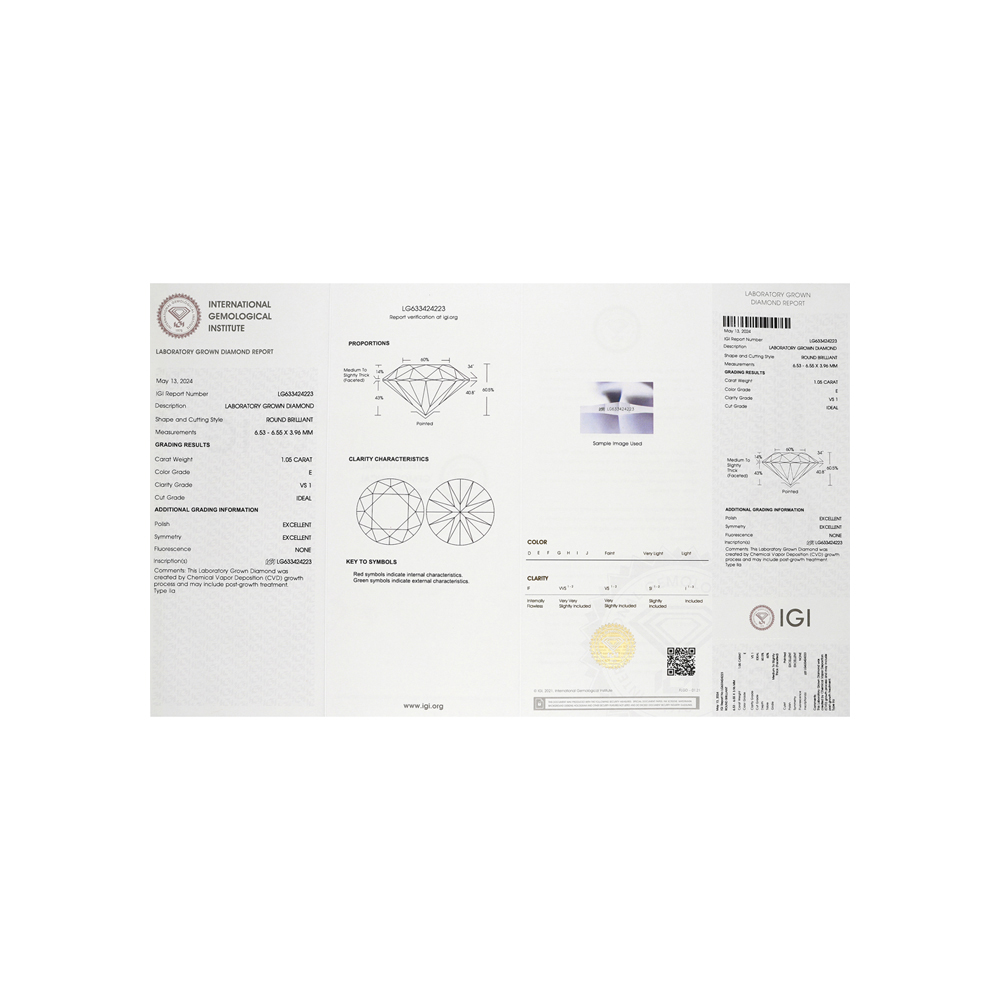 1 бриллиантом выращенным, 1.01 карат, огранка круг 57 граней, цвет 1, чистота 3, тип огранки А;