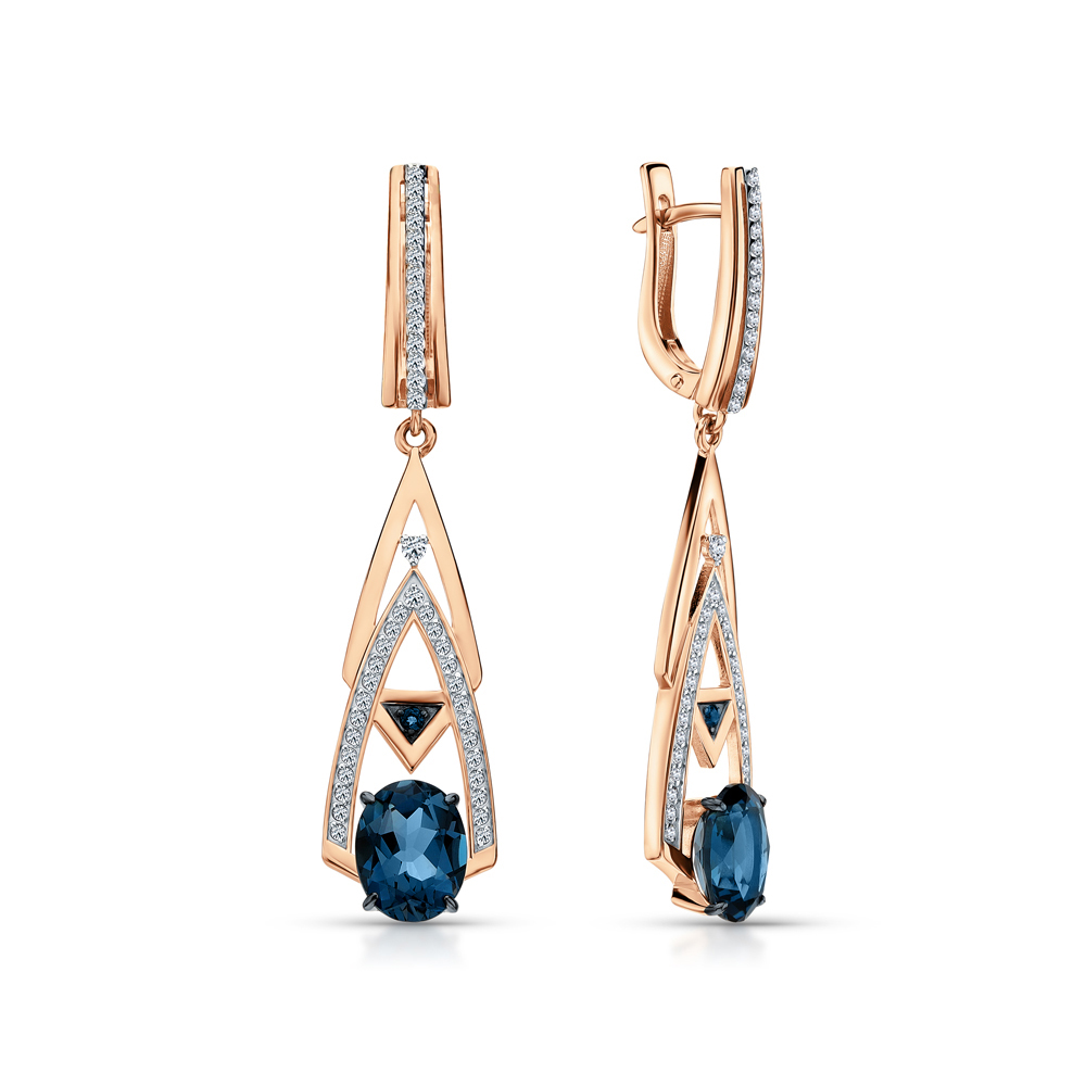 Золотые серьги с бриллиантами и бриллиантами чёрными природными и сапфирами природными