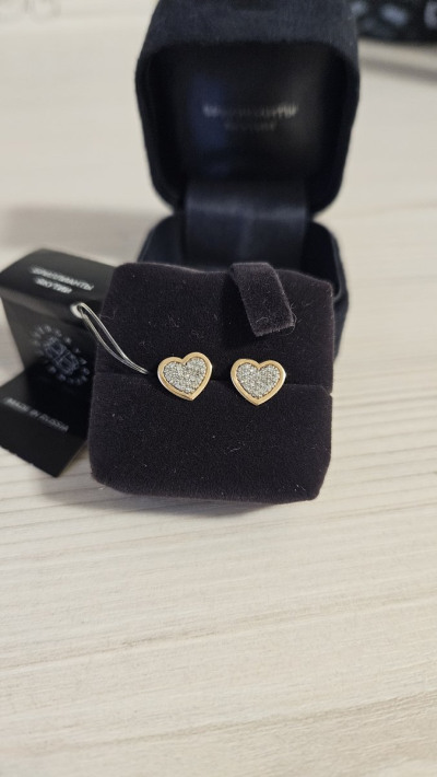 Очень красивые серьги-сердечки с бриллиантовой крошкой-россыпью. Смотрятся эффектно. Можно носить как основные. Они плоские, что красиво смотрится на мочке, сидят, как влитые. Но при этом серьги не маленькие, но легкие и удобные.