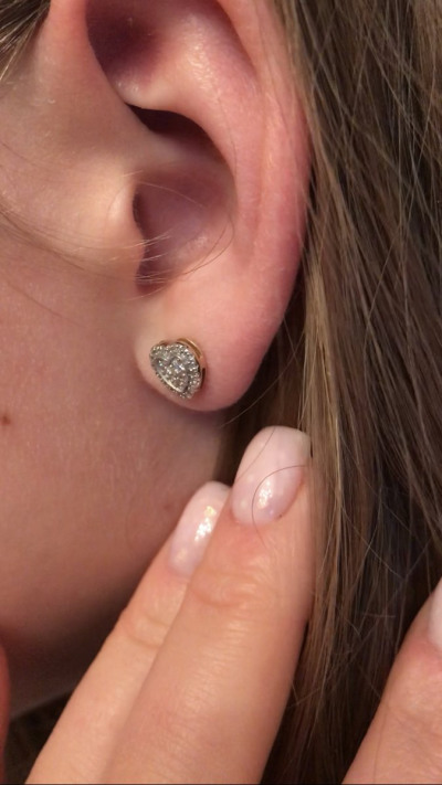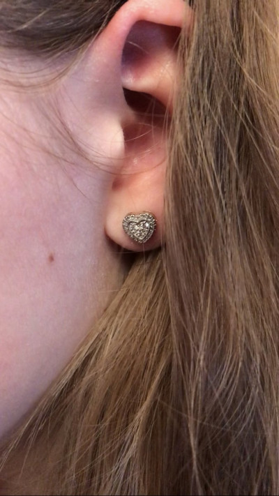 Красивая нежная форма сердечка, объемные, хорошо сидят на ушке. На солнце сверкают всеми цветами, несмотря на то что камушки маленькие.