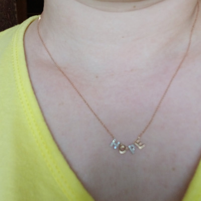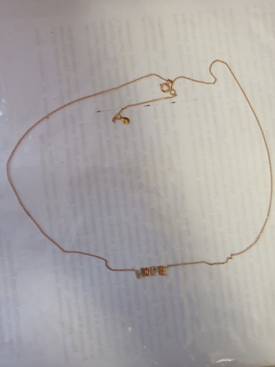 Изящное изделие с маленькими бриллиантиками. Цепочка тоненькая, но и заявлено 1.52 гр., надпись периодически смещается, но я выкупила, так как я -Надежда-HOPE по английски.