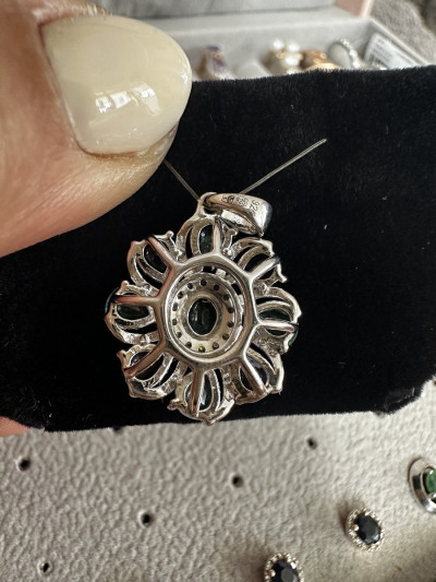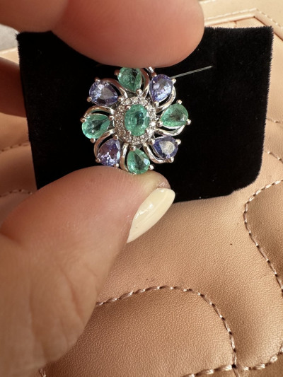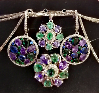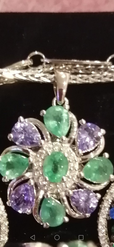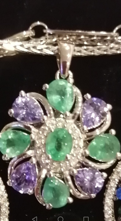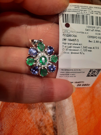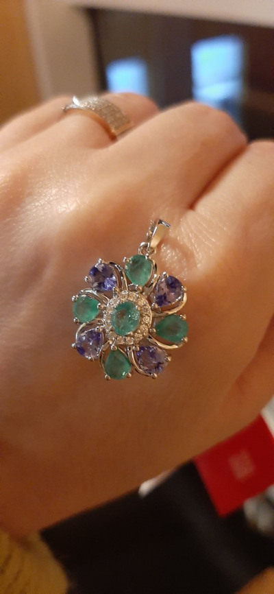 Эффектная серебряная подвеска с яркими натуральными камнями. Очень заметное украшение, смотрится дорого. Изумруды и танзаниты отлично сочетаются и дополняют друг друга. Лучше было бы без фианитов, но их, к счастью, немного. В общем и целом, отличная подвеска на 5 звёзд.