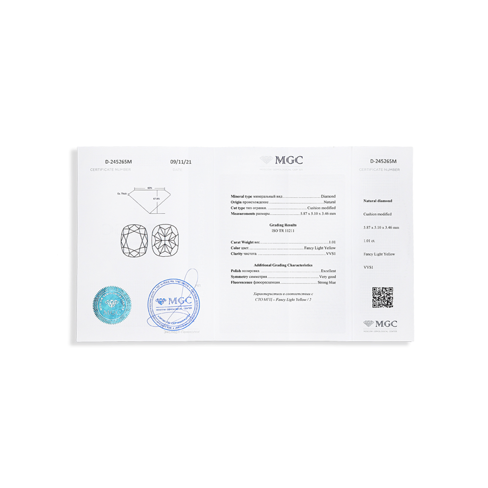 1 бриллиантом желтым природным, 1 карат, цвет 8-5, чистота 7, тип огранки Б;