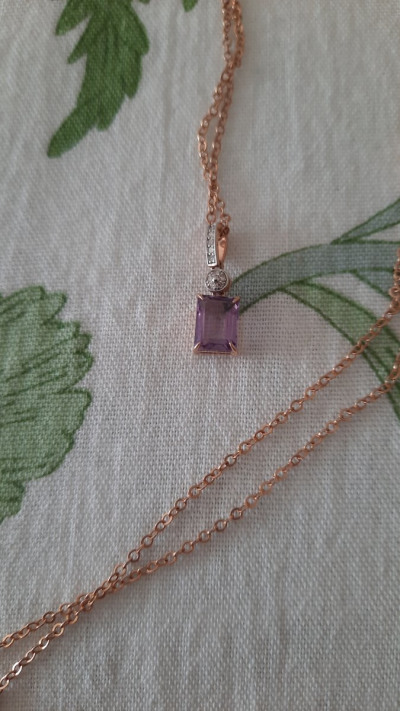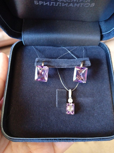 Небольшое изящное изделие с ярким прямоугольник камнем размером 8*5 мм. Цвет нежно сиреневый. Смотрится замечательно в комплекте с серьгами с таким же камнем. Покупка отличная