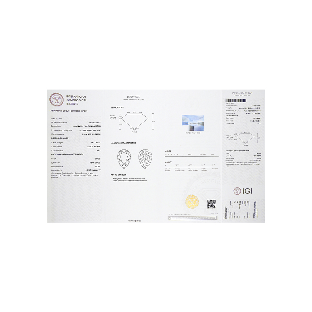 Подвеска с 1 бриллиантом выращенным, 1.01 карат, огранка груша 56 граней, цвет Желтый, чистота 5, тип огранки А;