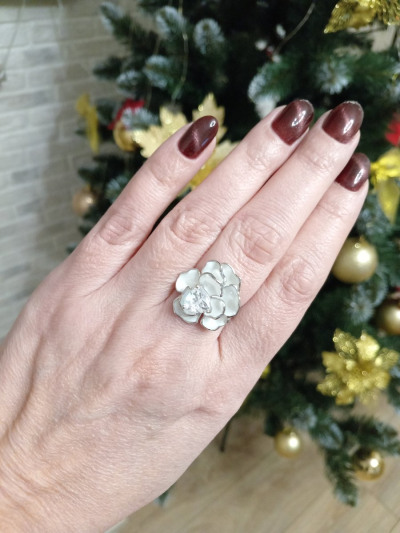 Приобрела это кольцо и не могу нарадоваться! Дизайн в виде цветка выглядит очень изысканно: белые лепестки с серебристой окантовкой создают ощущение лёгкости и утончённости. Центральный камень просто завораживает - так красиво переливается на свету! Отлично дополняет любой образ. При выборе размера - берите свой, это кольцо полноразмерное. Жаль только, что нет уже к нему в комплект серёжек... Спасибо Санлайт за красоту! Рекомендую!