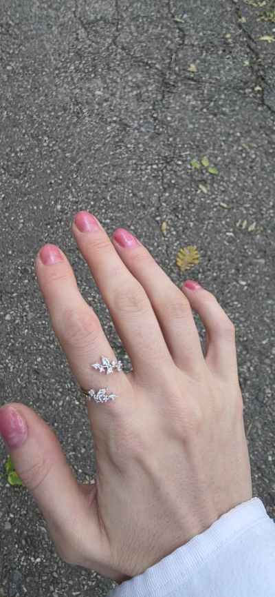 Боялась, что будет цепляться и царапаться из-за острых краев, но такой проблемы почти нет. На руке смотрится нежно, гармонично сочетается с любой одеждой. На пальце вообще не ощущается его вес. Прелесть)