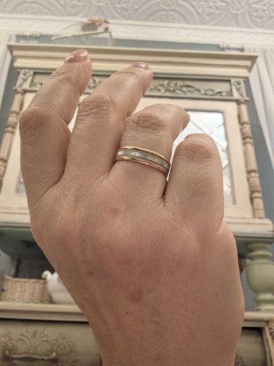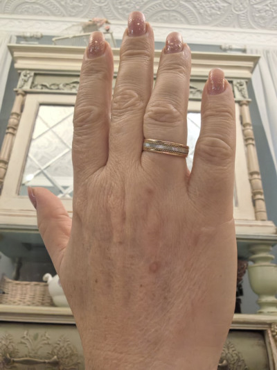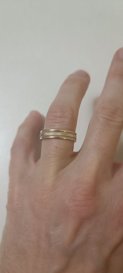 Колечко тактильно очень приятное за счёт отсутствия острых граней. Ощутимое по весу, но удивительное дело, на пальце совсем не ощущается, можно носить не снимая. Размер подобрала идеально. Интересное сочетание белого, золотого и розового золота, белая вставка красиво переливается за счет гравировки. Очень рекомендую.