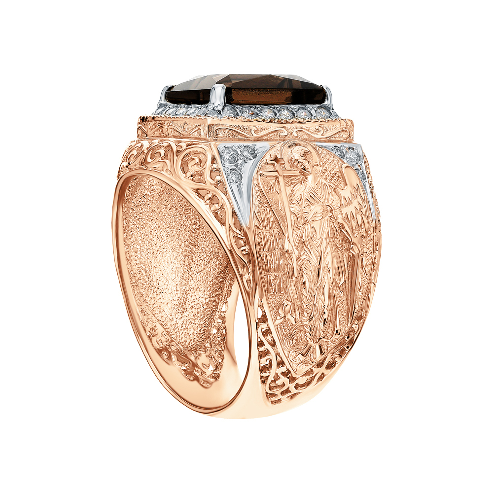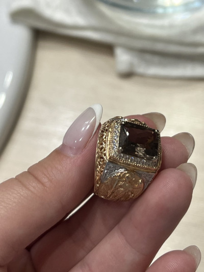Золотое кольцо с фианитами и кварцами дымчатыми природными