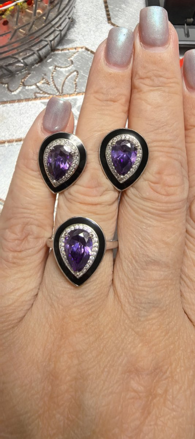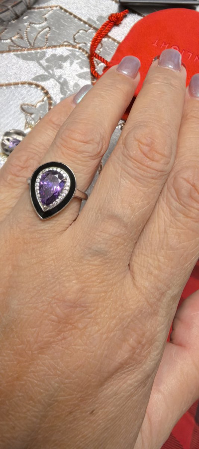 Красивое серебряное кольцо с сиреневым фианитом под аметист, прекрасное сочетание серебра и черной эмали!