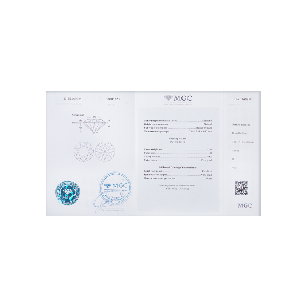 Кольцо с 1 бриллиантом природным, 1.5 карат, огранка круг 57 граней, цвет 5, чистота 5, тип огранки А;