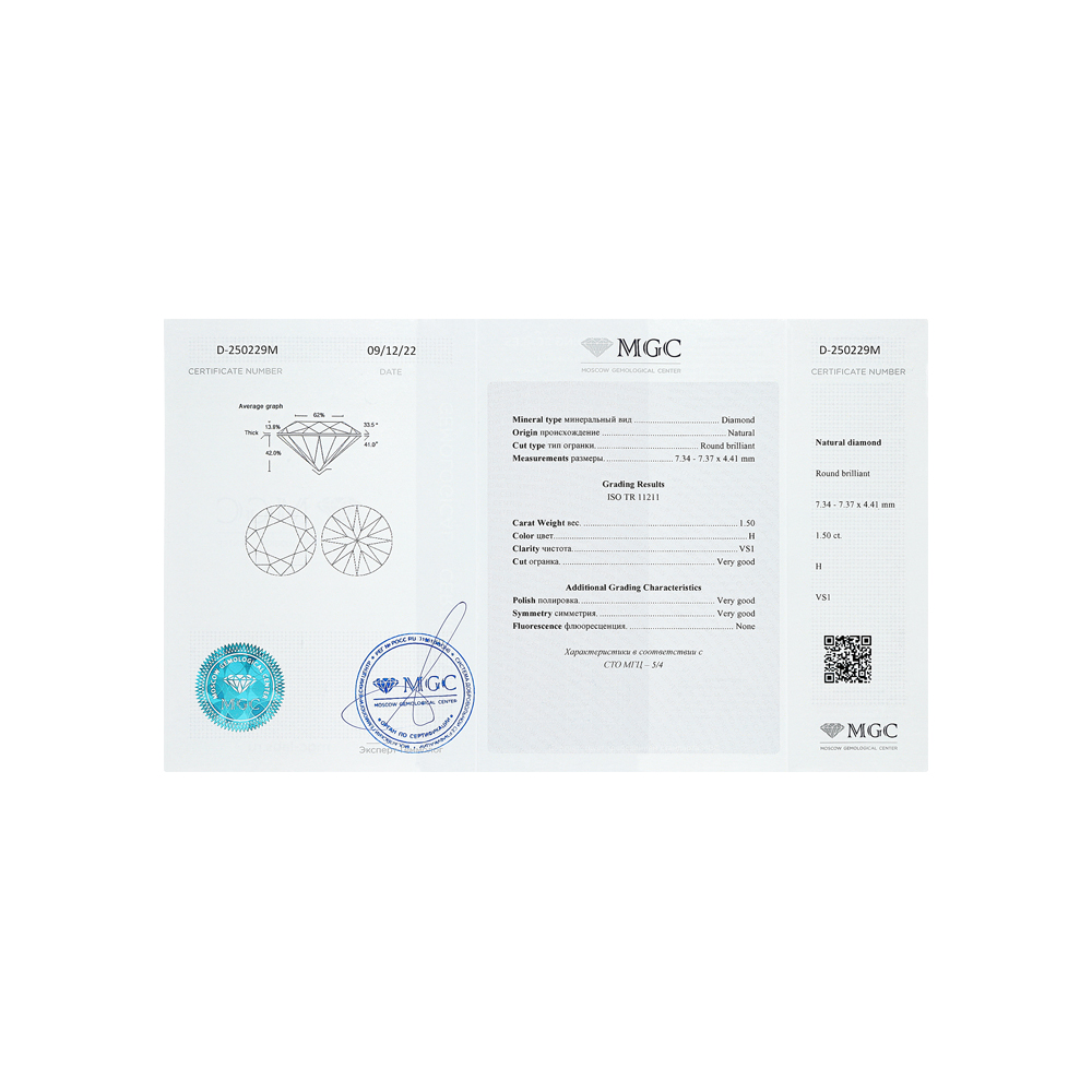 • Кольцо с 1 бриллиантом природным, 1.5 карат, огранка круг 57 граней, цвет 5, чистота 4, тип огранки А;