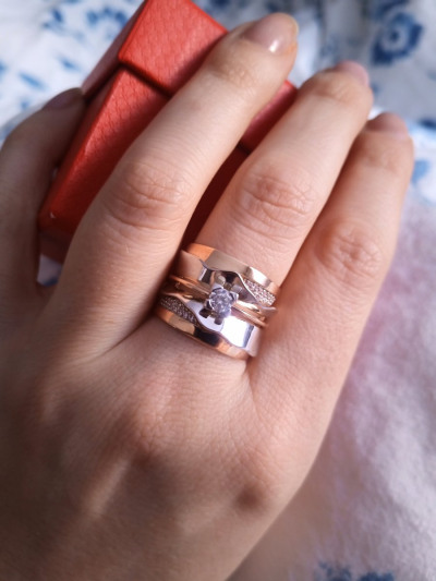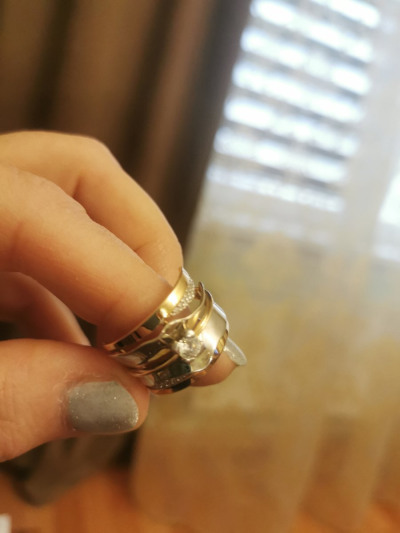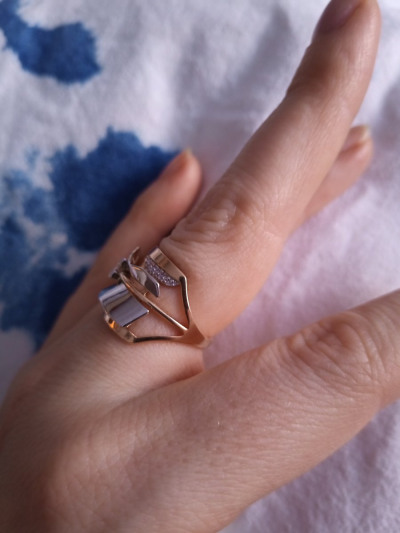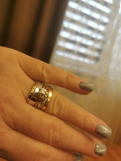 На палец 17 заказала 17,5, подошло идеально. Объемное, но по бокам между пальцами не мешает ничего, что огромный плюс. Красивое сочетание. Обычно ношу только белый металл, но именно это кольцо мне очень понравилось.