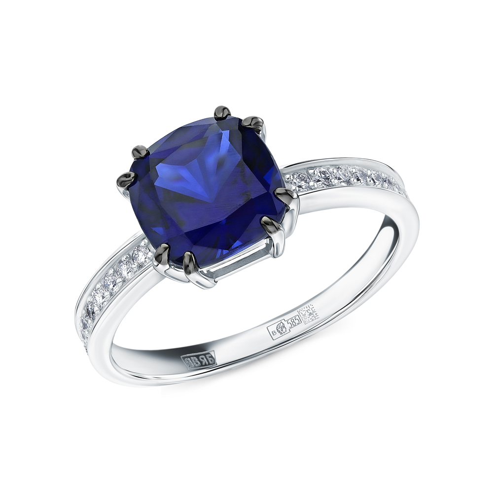 Золотое кольцо с бриллиантами выращенными и сапфиром выращенным