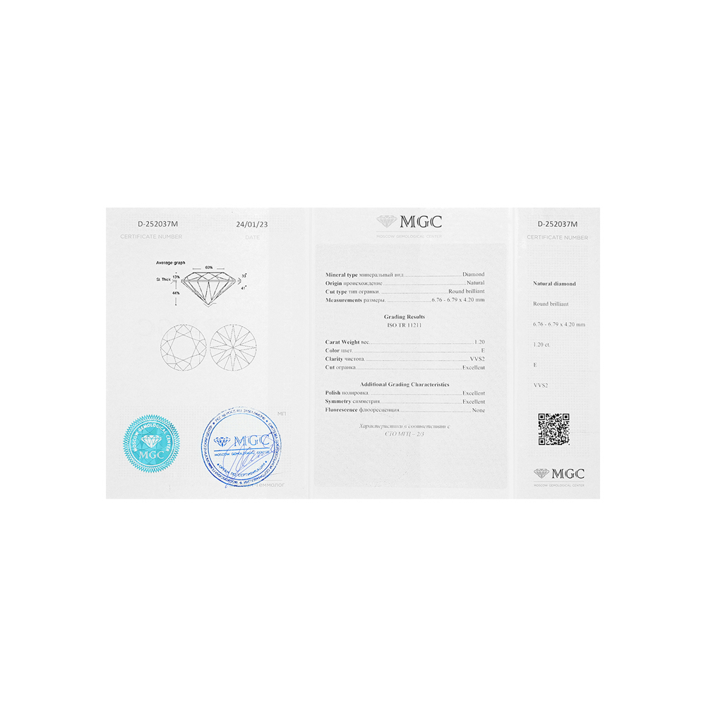 Кольцо с 1 бриллиантом природным, 1.2 карат, огранка круг 57 граней, цвет 2, чистота 3, тип огранки А;