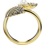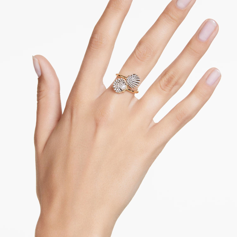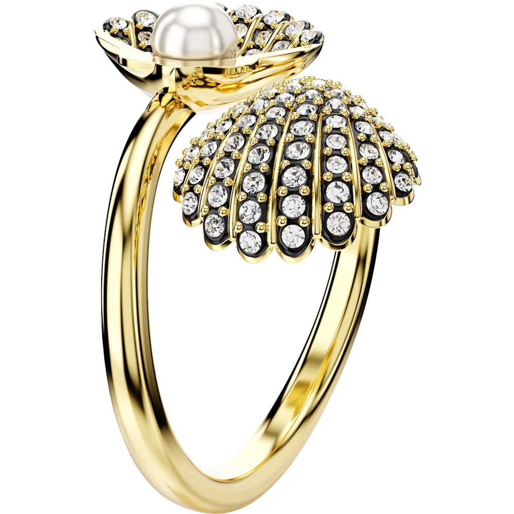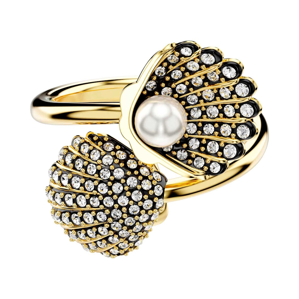 Кольцо от бренда SWAROVSKI, выполненное из нержавеющей стали с гальваническим покрытием, из коллекции Idyllia подобно яркому сокровищу, найденному на берегу океана, создано для привлечения внимания. Кольцо с золотым напылением по краям украшают две ракушки, декорированные прозрачными круглыми кристаллами, установленными в черную эпоксидную смолу, а в центре одной из них сверкает белая кристальная жемчужина. Гарантия 14 дней
