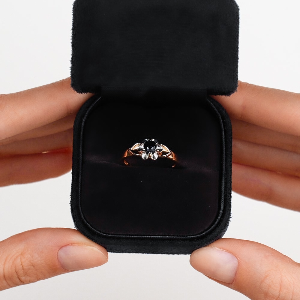 Кольцо из розового золота с сапфирами выполнено в романтическом стиле. Накладка из белого золота в форме цветка добавляет объем кольцу и подчеркивает красоту камня.