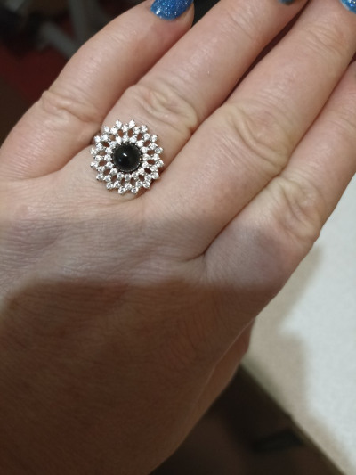 Яркое серебряное кольцо с черным агатом и фианитами. Довольно крупное. Диаметр "цветка" 15 мм, диаметр агата-бусинки 5 мм. Вес 4,08 грамма, размер 18,5. Долго "ловила" возможность доставки в наш пункт выдачи заказов. Наконец собрала весь комплект. Очень довольна. Спасибо мастеру- ювелиру за тонкую работу и Санлайт за возможность купить такую красоту.