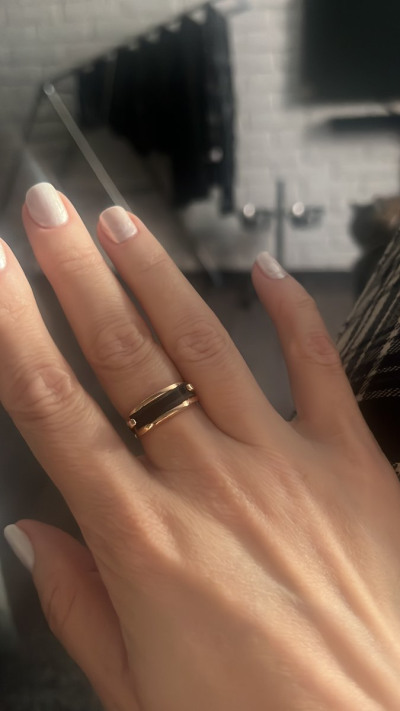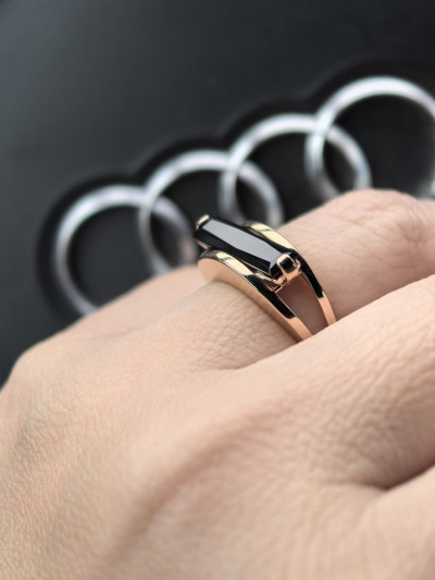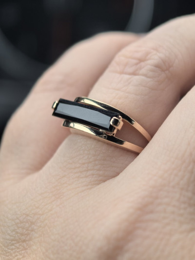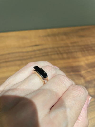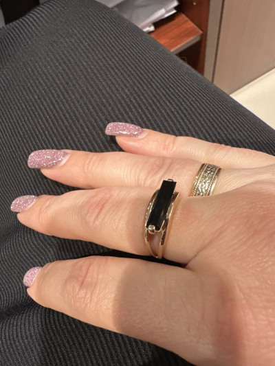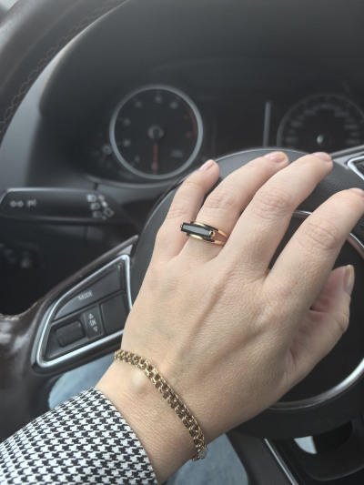 Любовь случилась с первой фотографии. Это колечко сразу же покорило моё сердце своей нестандартностью. Никакой вычурности дизайна, сдержанная и строгая красота в простоте. Оно просто невероятное. Шарма изделию придаёт чёрный Агат прямоугольный формы. Поверхность отшлифована идеально, на гранях нет никаких шероховатостей. Оно совершенно не плоское, а немного приподнятое, возвышается над пальцем. Смотрится дорого, обращает на себя внимание. Украшение, которое рядом с собой абсолютно не требует компании.