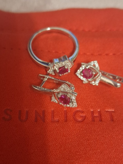 Очень захотелось купить украшения с рубинами, выбрала этот комплект, колечко, серёжки и подвеска с цепочкой. Интересный дизайн, яркие, нарядные, можно и на каждый день