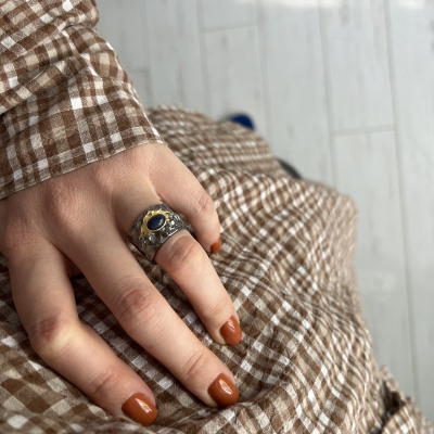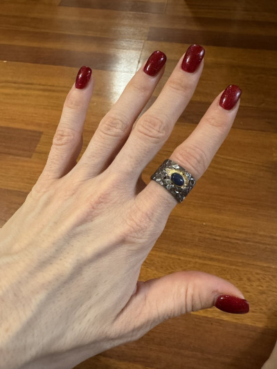 Очень интересное и красивое кольцо, обожаю содалит. размер подошел, хотя и опасалась из-за ширины ободка. теперь хочу купить такое же в белом серебре.
