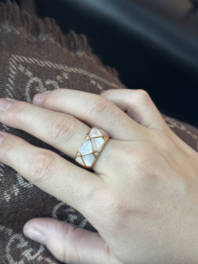 Влюбилась в это кольцо с первого взгляда. Шикарное. Маломерит на 0.5 - 1 размер. Шинка широкая. Еще бы к нему серьги конго были бы очень кстати. Уже такое было. Покупала кольцо. Серьги такого же дизайна появились через 1 год. Может все таки появятся серьги с перламутром?!💥💥💥