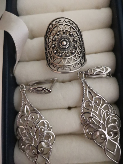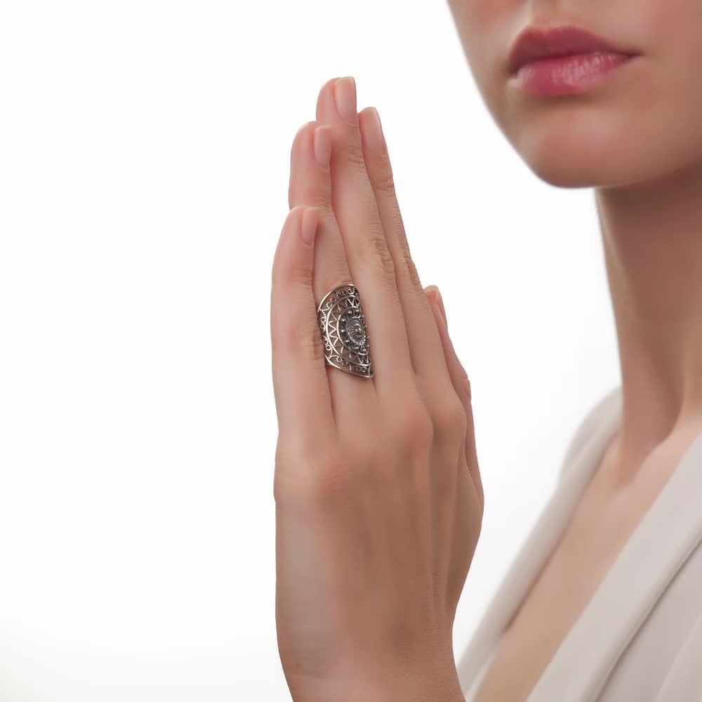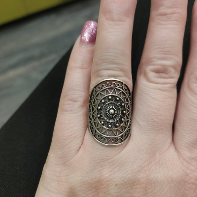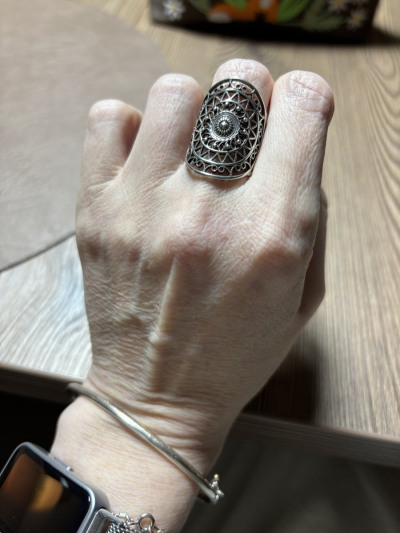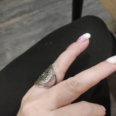 Очень красивый удобный на пальце, лёгкий, серебро, в комплекте с серёжка и огонь!!! Спасибо санлайт!!!!